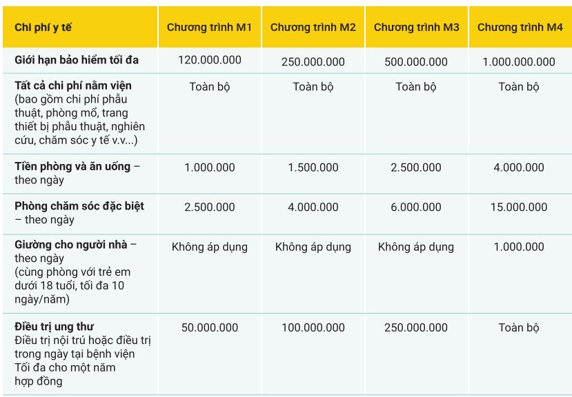 - Không giới hạn chi phí nằm viện và số ngày nằm viện